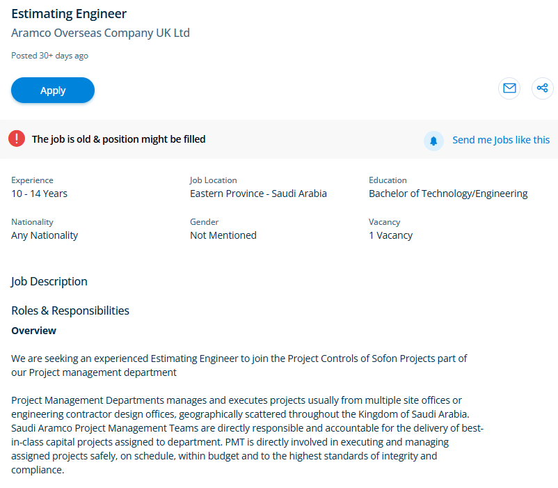 বিশ্ববিখ্যাত Aramco Overseas Company UK Ltd সম্প্রতি Estimating Engineer পদে নিয়োগ বিজ্ঞপ্তি প্রকাশ করেছে। অভিজ্ঞ প্রকৌশলীদের জন্য এটি সৌদি আরবের ইস্টার্ন প্রভিন্সে কাজ করার একটি অসাধারণ সুযোগ। যারা বিদেশে ক্যারিয়ার গড়তে চান, তাদের জন্য এই আরামকো কোম্পানি সৌদি আরব নিয়োগ হতে পারে একটি স্বপ্নের সুযোগ।