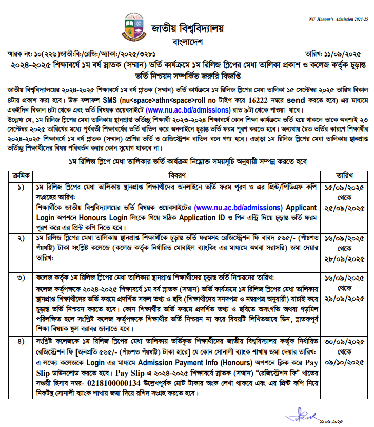 The National University’s 2024-2025 academic session 1st-year undergraduate (honors) admission 1st release merit list will be published on September 15, 2025, at 4 PM. This blog post provides essential details and deadlines for admission confirmation, fee submission, and registration.